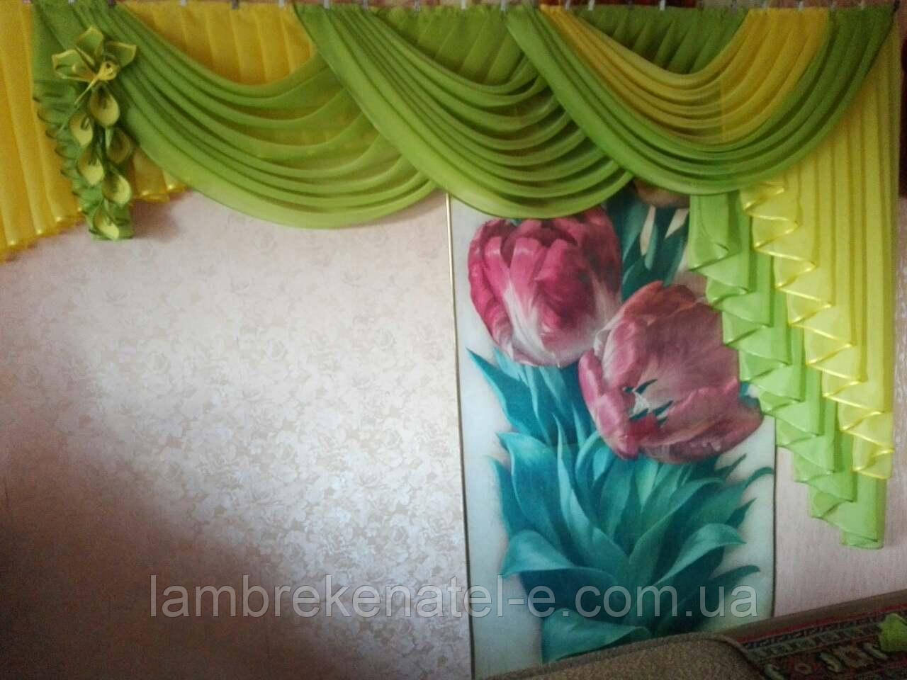 Ламбрекен Ніжність 3 метри. Жовто-салатоа кольору. Виготовлений як модифікація популярної основної моделі. Додані елементи (провіси та бантова складка). Розмір збільшений від двох до трьох метрів по карнизу. Колір — обраний за заявкою клієнта.